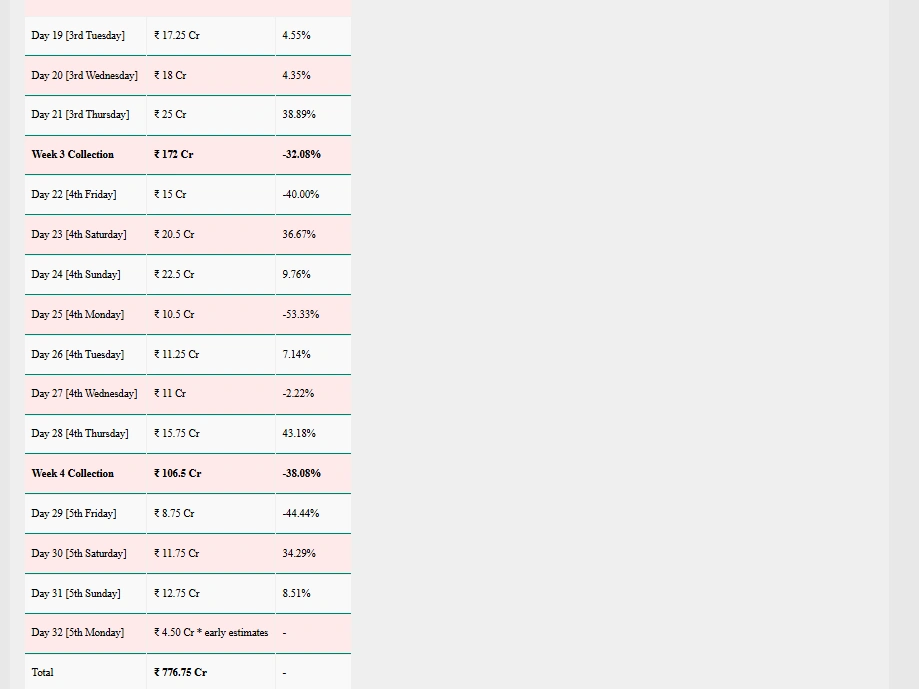 भारत में धुरंधर का टोटल कलेक्शन 776.75 करोड़ रुपए हो चुका है। वहीं, धुरंधर का अभी तक वर्ल्ड वाइड कलेक्शन 1215 करोड़ हो गया है। ये कमाई अपने आप में एतिहासिक है। लेकिन अचानक से आयी गिरवाट फैंस को थोड़ा निराश कर सकती है। धुरंधर बॉक्स ऑफिस कलेक्शन के ये आंकड़े Sacnilk ने जारी किए हैं।