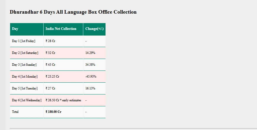 ‘धुरंधर’ ने पांचवें दिन 27 करोड़ रुपए कमाए थे। थोड़ी सी गिरावट मूवी की कमाई में जरुर आयी है। लेकिन फिर भी वो भारत में 180 करोड़ रुपए कमा चुकी है। वहीं, दुनियाभर में टोटल कलेक्शन 233.50 करोड़ रुपए कर चुकी है। बॉक्स ऑफिस कलेक्शन के ये आंकड़े Sacnilk ने जारी किए हैं।