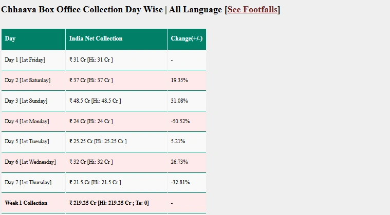 इस फिल्म का बजट 130 करोड़ के आस-पास था। लेकिन इसने 800 करोड़ से ज्यादा की कमाई की थी। ‘छावा’ ने रिलीज के सातवें दिन 21.5 करोड़ रुपए का बॉलीवुड बॉक्स ऑफिस कलेक्शन किया था। वहीं, इसकी टोटल कमाई एक हफ्ते की 219.25 करोड़ रुपए थी। वहीं, ‘धुरंधर’ ने सातवें दिन 27 करोड़ रुपए रहा है। वहीं, इसकी भारत में टोटल कमाई 207.25 करोड़ रुपए रही है। लेकिन इसने सातवें दिन ‘छावा’ से ज्यादा कमाए थे। बॉक्स ऑफिस कलेक्शन के ये आंकड़े Sacnilk ने जारी किए हैं।