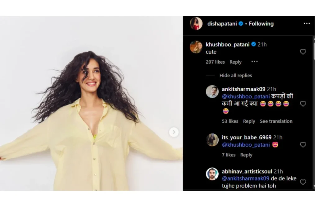 दिशा पटानी के इस पोस्ट की बात करें तो वह लाइट येलो शर्ट में पोज देती हुई नजर आ रही है। इस दौरान उन्होंने ऊपर के बटन भी खोल रखे हैं और कर्व्स को फ्लॉन्ट करती हुई दिख रही है। कॉन्फिडेंस के साथ अपने लुक को वह स्टाइल कर रही है। यह उनके फैंस को दीवाना बना देने के लिए काफी है। Disha Patani के चेहरे की मुस्कान, ग्लौसी लिप्स, शाइनी मेकअप के साथ हैवी मस्कारा दिशा लुक में चार चांद लगा रहा है जिसे देख निश्चित तौर पर फैंस बेहाल नजर आ रहे हैं। इस सब के बीच खुशबू पटानी का रिएक्शन चर्चा में है।