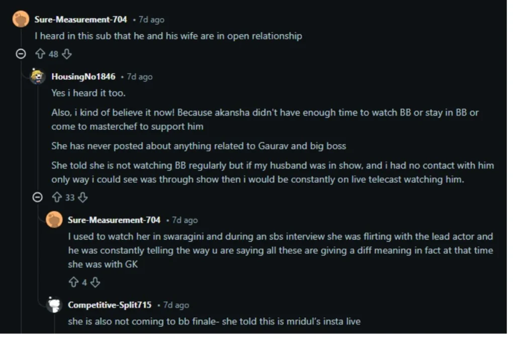 बिग बॉस 19 विनर गौरव खन्ना को लेकर इस पोस्ट पर एक यूजर ने कहा, “मैंने इस समय सुना है कि वह और उसकी पत्नी ओपन रिलेशनशिप में हैं।” वहीं एक यूजर ने कहा और अब मुझे भी तो इस पर थोड़ा यकीन हो रहा है क्योंकि आकांक्षा के पास बिग बॉस देखने या बिग बॉस में रहने के साथ-साथ मास्टरशेफ में आकर उसे सपोर्ट करने के लिए भी समय नहीं था। उसने गौरव और बिग बॉस से जुड़ी किसी भी चीज के बारे में कभी पोस्ट नहीं किया। इतना ही नहीं लोगों ने यह भी कहा कि आकांक्षा चमोला ने खुद बताया कि वह रेगुलर बिग बॉस नहीं देख रही थी।