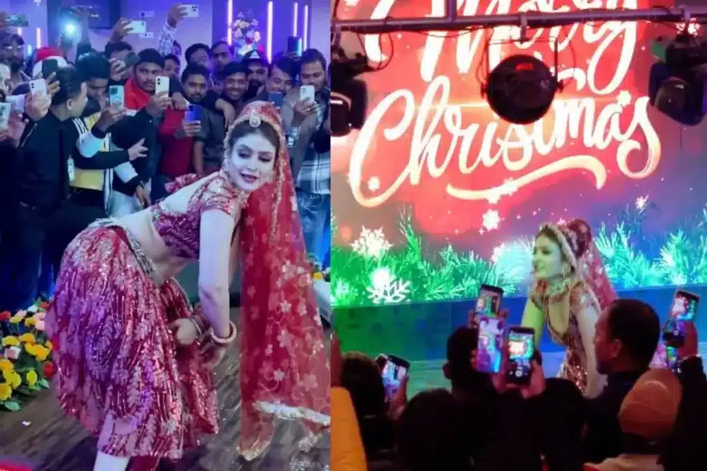 इस वीडियो में आप देख सकते हैं कि, डांसर ने लाल कलर का लहंगा और चोली पहना हुआ है। इस दौरान वह बेहद खूबसूरत लग रही हैं। उनको देख वहां की भीड़ काफी बेकाबू हो गई है।वायरल वीडियो में आप देख सकते हैं कि, गोरी नागोरी हरियाणवी गाने ठुमका Thumka पर डांस कर रही हैं। इस दौरान वो जबरदस्त तरह से अपनी कमर मटका रही हैं। इनकी इन्ही अदाओं को देख भीड़ ने उन्हें अपने फोन में कैद करने के लिए कैमरे निकाल लिए हैं। इस डांस पर उनका अलग ही रिएक्शन देखने को मिल रहा है। गोरी नागोरी जितनी खूबसूरत है। उतना ही खूबसूरत वो डांस भी कर रही हैं।