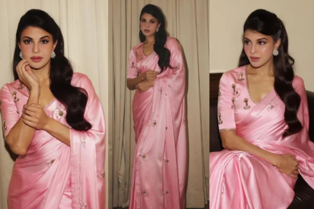 जहां तक बात करें जैकलिन फर्नांडीस के लेटेस्ट लुक की तो वह पिंक साड़ी को स्टाइल करती हुई नजर आई है जिसमें गोल्डन एंब्रॉयडरी वर्क है। वहीं इस साड़ी के साथ Jacqueline Fernandez क्वार्टर स्लिव ब्लाउज को फुल नेक में स्टाइल करती हुई दिखी है और यह आगे से राउंड शेप में है। फतेह एक्ट्रेस के इस फैशन सेंस को देख आप वाकई फैन हो जाएंगे और आपकी नजरे नहीं हटेगी। जैकलिन फर्नांडीस ने अपने लुक को सॉफ्ट कर्ल हेयर स्टाइल से कंप्लीट किया तो हाफ पिनअप करके Fateh एक्ट्रेस इसे ओपन स्टाइल में फ्लॉन्ट करती दिखीं है। एक्सेसरीज के नाम पर Jacqueline Fernandez सिर्फ इयररिंग्स को फ्लॉन्ट करती दिखी है।