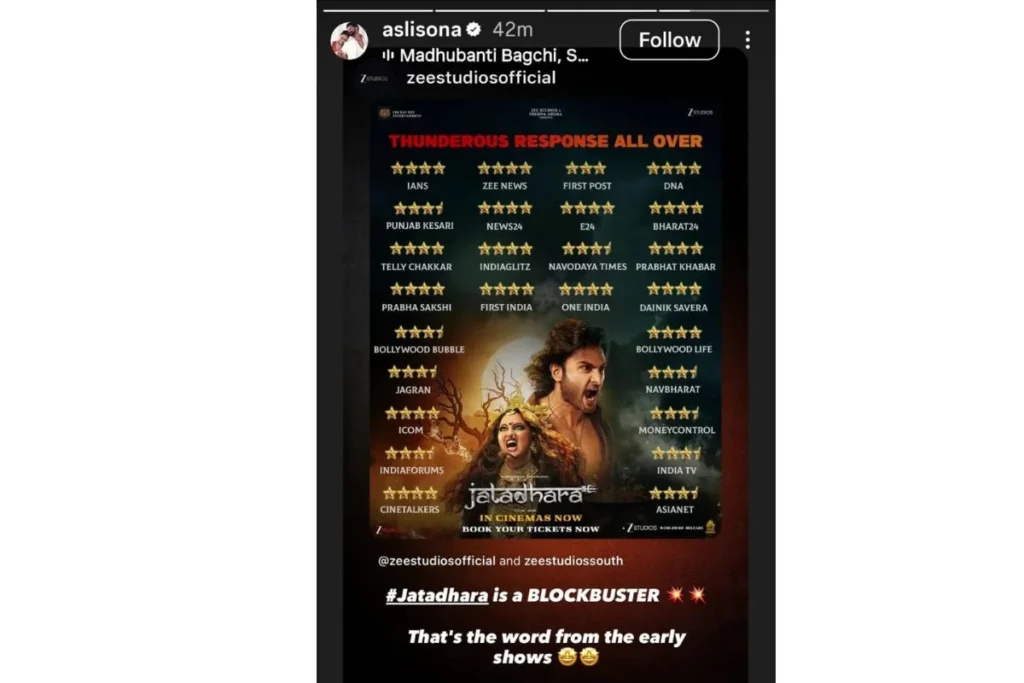 जेठालाल मूवी रिव्यू की बात करें तो इस सब के बीच खुद सोनाक्षी सिन्हा ने अलग-अलग मीडिया प्लेटफॉर्म से मिले हुए रिव्यू को इंस्टाग्राम पर शेयर करते हुए इसे ब्लॉकबस्टर बताती है। सोनाक्षी सिन्हा ने लिखा जटाधारा ब्लॉकबस्टर सिर्फ यही एक शब्द है जो अर्ली शोज को देखकर आ रहा है। ऐसे में पिशाचिनी का किरदार निभाने वाली सोनाक्षी सिन्हा की तरफ से उनके फैंस को ग्रीन सिग्नल मिल गया है लेकिन इसकी कहानी बहुत लोगों को पसंद नहीं आई है।