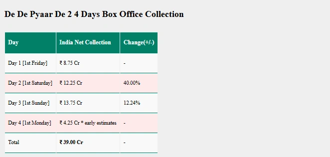 अजय देवगन की रोमांटिक कॉमेडी फिल्म का ऑपनिंग डे कलेक्शन 8.75 करोड़ रुपए था। दूसरे दिन 12.25 करोड़ की बंपर कमाई हुई, तीसरे दिन 13.75 करोड़ का कलेक्शन किया। लेकिन चौथे दिन फिल्म मेकर्स को बड़ा झटका लगा और ये फिल्म सिर्फ 4.25 करोड़ रुपए ही कमा सकी। ‘दे दे प्यार 2’ का टोटल कलेक्शन 39 करोड़ रुपए है। इस बॉलीवुड फिल्म के कलेक्शन पर आयी गिरावट का कारण तेलगू फिल्म ‘कांथा’ को माना जा रहा है। चौथे दिन दुलकर सलमान की फिल्म ने सिर्फ 1.65 करोड़ रुपए ही कमाए हैं। कहीं ना कहीं ये मूवी अजय देवगन की फिल्म को टक्कर दे रही है। बॉक्स ऑफिस कलेक्शन के ये आंकड़े Sacnilk ने जारी किए हैं।