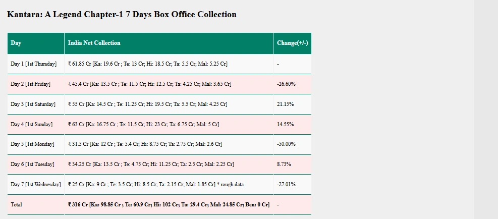 कांतारा चैप्टर 1 बॉक्स ऑफिस कलेक्शन 7 की बात करें इस फिल्म ने 25 करोड़ का कलेक्शन किया है।