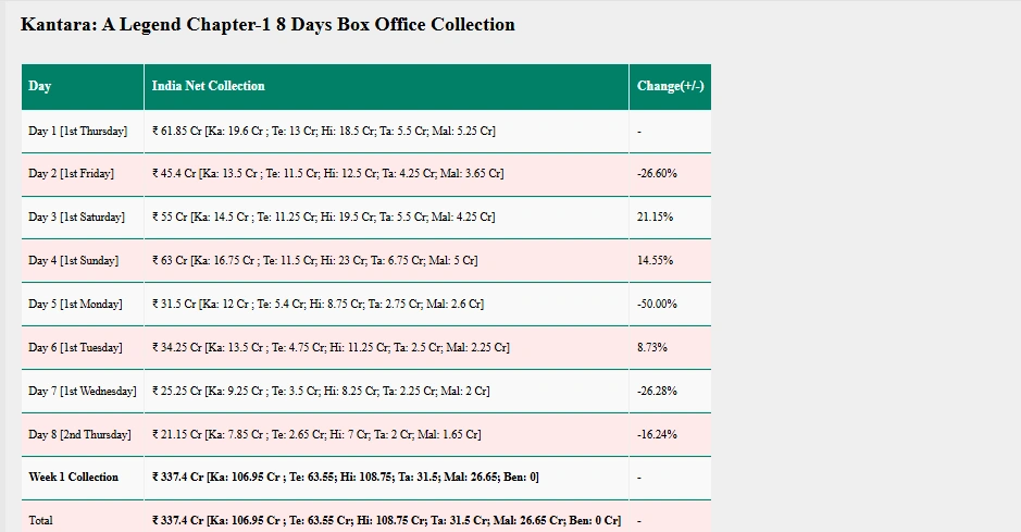 कांतारा चैप्टर 1 का बॉक्स ऑफिस कलेक्शन आठवें दिन 21 .15 करोड़ रुपए हुआ है। वहीं, भारत में ये फिल्म अभी तक 337.4 करोड़ रुपए कमा चुकी हैं।
