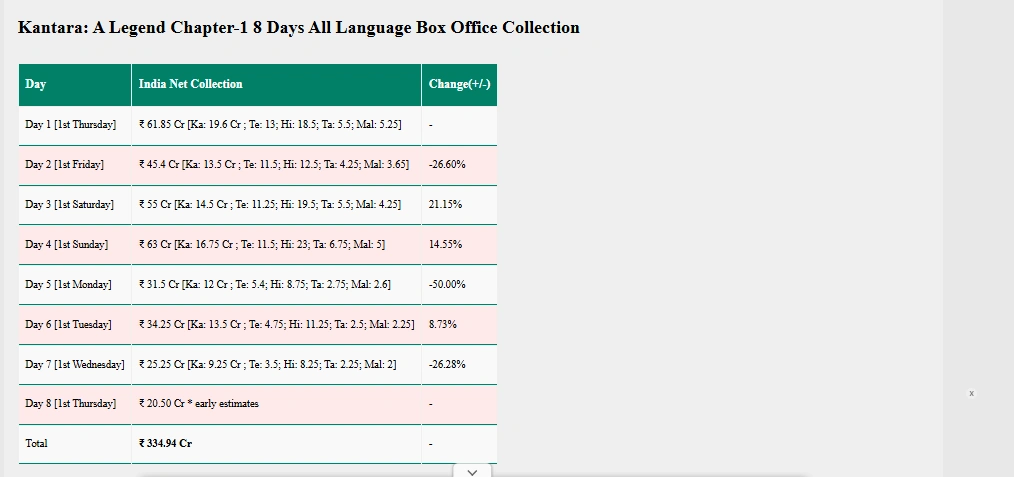 ऑपनिंग डे पर 61.85 करोड़ कमाने वाली ये फिल्म भारत में ही 334.94 करोड़ का कलेक्शन कर चुकी है। वहीं, कांतारा चैप्टर 1 वर्ल्ड वाइड कलेक्शन लगभग 470 करोड़ के आस-पास है। वीकेंड पर ये रिकॉर्ड तोड़ते हुए 500 करोड़ का कलेक्शन कर सकती हैं। ये फिल्म का अब तक का सबसे बड़ा रिकॉर्ड होगा। आदिवासी और उनके दे-वी देवताओं पर आधारित इस फिल्म के राइटर, एक्टर, प्रोडयूसर और डायरेक्टर ऋषभ शेट्टी हैं। उनकी एक्टिंग लोगों के दिल और दिमाग पर चढ़कर बोल रही है। कांतारा बॉक्स ऑफिस कलेक्शन के ये आंकड़े Sacnilk ने जारी किए हैं।