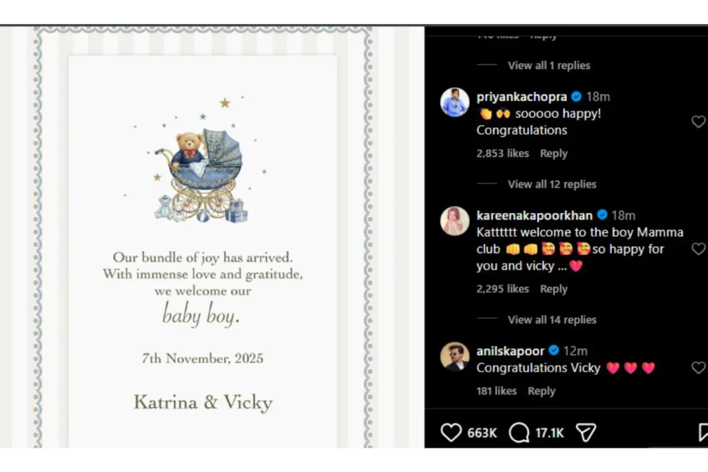 विक्की कौशल ने कैटरीना कैफ के साथ एक पोस्ट में लिखा, “हमारा नाम मेहमान आ गया बहुत सारा प्यार और आभार के साथ हम अपने बेटे का स्वागत करते हैं। 7 नंबर 2025 धन्य हूं ओम।” कैपश्न के साथ इस पोस्ट को शेयर किया गया जिस पर लोगों की प्रतिक्रियाएं सामने आ रही है।