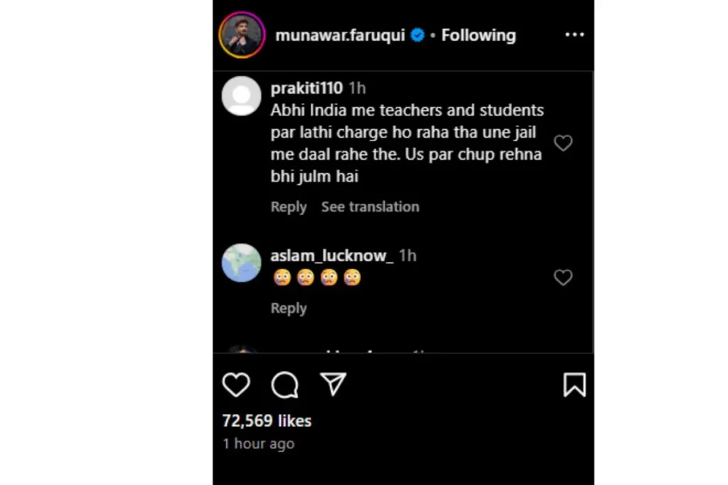 मुनव्वर फारुकी ने इंस्टाग्राम पर लिखा, “फर्क नहीं पड़ता आपका धर्म कौन सा है जुल्म इंसानियत पर है। गाजा के लिए प्रार्थना न्याय के लिए शोर मचाता है।” वह कहते हैं ये जंग नहीं जुल्म है। किसी का हक मारना है किसी के घर उजाड़ना, किसी को भूख से मार देना ये जंग नहीं जुल्म है। पूरी दुनिया का चुप रहना यह जुल्म है। कॉमेडियन ने एक वीडियो को शेयर किया है जहां वह Gaza में भुखमरी और अन्न संकट का माहौल दिखाया जा रहा है। लोग खाने के लिए परेशान दिखाई दे रहे हैं। यहां तक की सड़क से भी खाना चुने जा रहे हैं और धूल फाकने पर मजबूर हो चुके हैं।