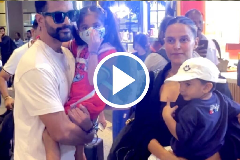 एयरपोर्ट पर फैमिली गोल देती दिखी Neha Dhupia, पति और बच्चों के साथ दिए जमकर पोज