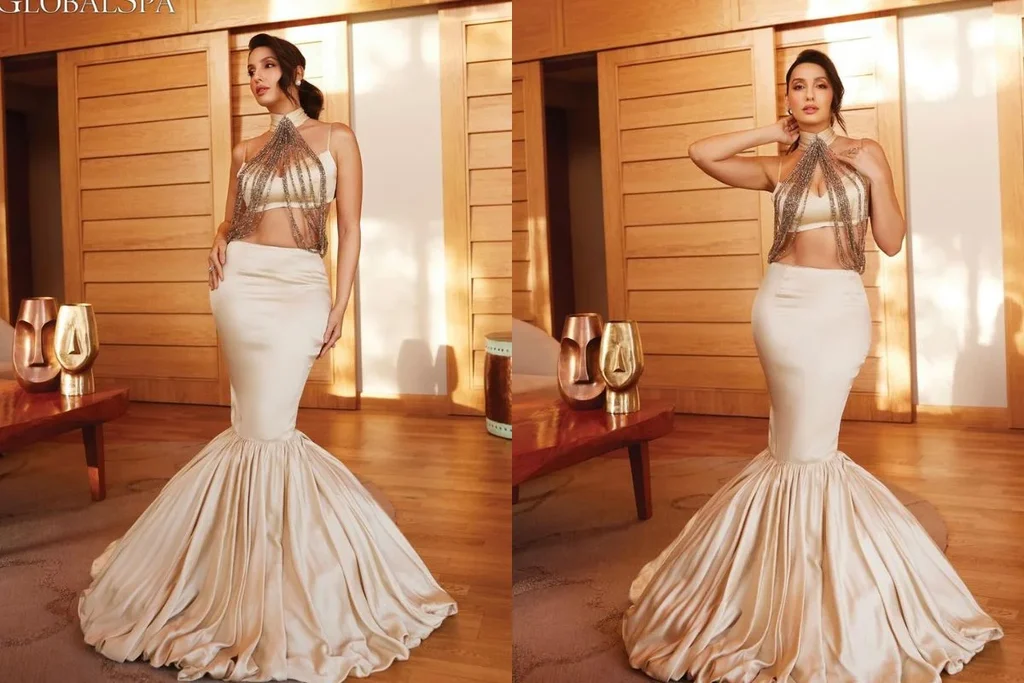 मर्मेड स्कर्ट विद ब्रालेट ब्लाउज में इठलाती Nora Fatehi