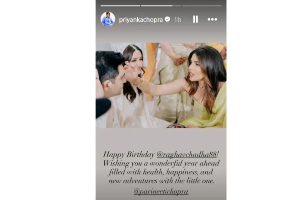 इस सबसे हटके प्रियंका चोपड़ा ने इंस्टाग्राम स्टोरी पर अपने जीजा राघव चड्ढा को शुभकामनाएं दी है और उन्होंने लिखा हैप्पी बर्थडे राघव चड्ढा। छोटे के साथ आने वाला वाला साल अद्भुत हो, स्वास्थ्यखुशी और न्यू एडवेंचर से भरपूर हो। इसके साथ ही उन्होंने परिणीति चोपड़ा को भी टैग किया।