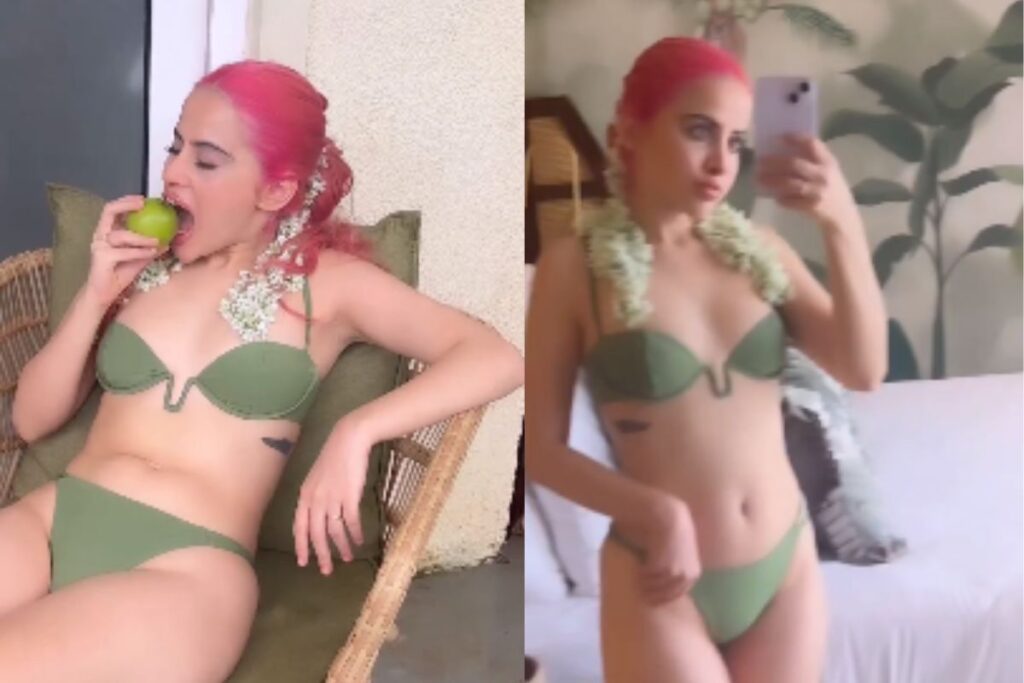 उर्फी जावेद ने अपने इंस्टाग्राम हैंडल पर एक वीडियो पोस्ट किया है। जिसमें उर्फी के नए लुक को देख फैन्स एक बार फिर उनके अदाओं के दीवाने होते हुए नजर आ रहे हैं। इस वीडियो में उर्फी ओलिव कलर की बिकनी पहनी हुई नजर रही है। साथ में उर्फी ने अपने बालों को पिंक कलर में बदलकर एकदम बार्बी स्टाइल बना लिया है। इस वीडियो में एक जगह उर्फी हरा सेब खाते हुए दिखाई दे रही है। तो वहीं दूसरी तरफ उर्फी मिरर सेल्फी में अपनी वीडियो बनाते हुए नजर आ रही है। इस वीडियो को इंस्टा पर पोस्ट करते हुए उर्फी ने हॉलीवुड का मशहूर सॉन्ग पॉपलुर लगाया हुआ है।