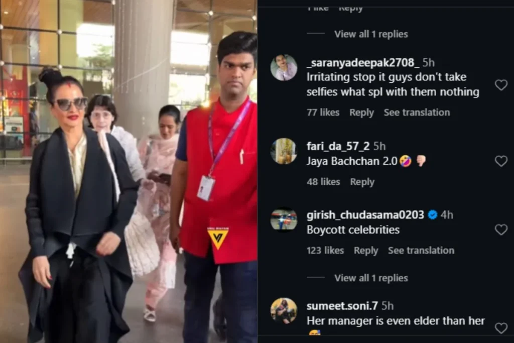 जब रेखा का यह वीडियो वायरल हुआ और फैन को सेल्फी के लिए मना कर रही एक्ट्रेस को लोगों ने देखा तो उनकी जया बच्चन के साथ तुलना करने लगे। जहां एक यूजर ने कहा कि अब इसमें और जया बच्चन में अंतर ही क्या है तो एक ने कहा जया बच्चन की तरह करने लगी। एक ने कहा मुझे उस औरत के लिए बुरा लग रहा है क्या हो जाता अगर कुछ सेकेंड के लिए सेल्फी ले लेती। एक ने कहा इस उम्र में इतना एटीट्यूड तो एक ने कहा यह तो बहुत ही इरिटेटिंग है। एक ने कहा जया बच्चन 2.0 तो एक ने लिखा बायकॉट करो इसे।