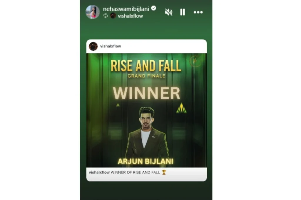 Rise And Fall Winner: आरुष भोला, आकृति नेगी और न जाने किन-किन नाम पर लगातार अफवाहें फैली हुई थी कि राइज एंड फॉल शो में उनकी जीत हुई है। इस सब के बीच अब अशनीर ग्रोवर के शो को अपना विनर ऑफीशियली मिल गया है। राइज एंड फॉल विनर कोई और नहीं बल्कि सबके चहेते अर्जुन बिजलानी है और सोशल मीडिया पर लोग उन्हें जमकर बधाई दे रहे हैं। वहीं इस सबके बीच सोशल मीडिया प्लेटफॉर्म इंस्टाग्राम पर अर्जुन बिजलानी की पत्नी नेहा स्वामी ने रिएक्ट किया है। दूसरी तरफ फाइनल एपिसोड में हमेशा जिस शख्स से अर्जुन बिजलानी की लड़ाई होती थी उन्हें किस किया है।