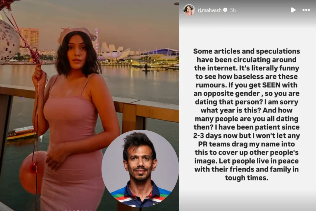 Yuzvendra Chahal संग अपने रिश्ते पर आरजे महवश ने सोशल मीडिया प्लेटफॉर्म के ज़रिए लोगों को जवाब दिया है। RJ Mahvash ने अपने सोशल मीडिया प्लेटफॉर्म पर एक स्टोरी लगाई है। जिसमे उन्होंने यूज़वेंद्र चहल संग रिश्तों पर खुल कर लोगों को सुनाया है। आरजे महवश ने इन तमाम अफवाओं को बेबुनियाद बताया है। साथ ही Yuzvendra Chahal संग अपना नाम जुड़ने पर लोगों से सवाल किया है। महवाश ने कहा है कि किसी लड़के के साथ दिखाई देने से कोई रिश्ता नहीं बन जाता है। साथ ही इन बेबुनियाद अफवाहों को खत्म करने की हिदायत दी है।