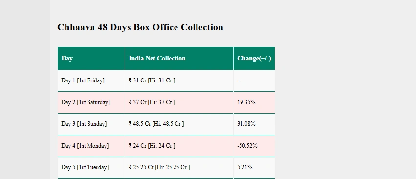 Saiyaara Box Office Collection Day 5 का लगभग Chhaava के बराबर था। सैयारा ने 25 करोड़ रुपए कमाए थे, वही, विक्की कौशल की इस फिल्म ने पांचवें दिन 25.25 करोड़ का कलेक्शन किया था। दोनों में बहुत ही मामूली सा फर्क था। वहीं, दंगल की छठे दिन की कमाई 21.46 करोड़ रुपए है। इसके साथ ही सैयारा की छठे दिन की कमाई 21 करोड़ रुपए हैं।