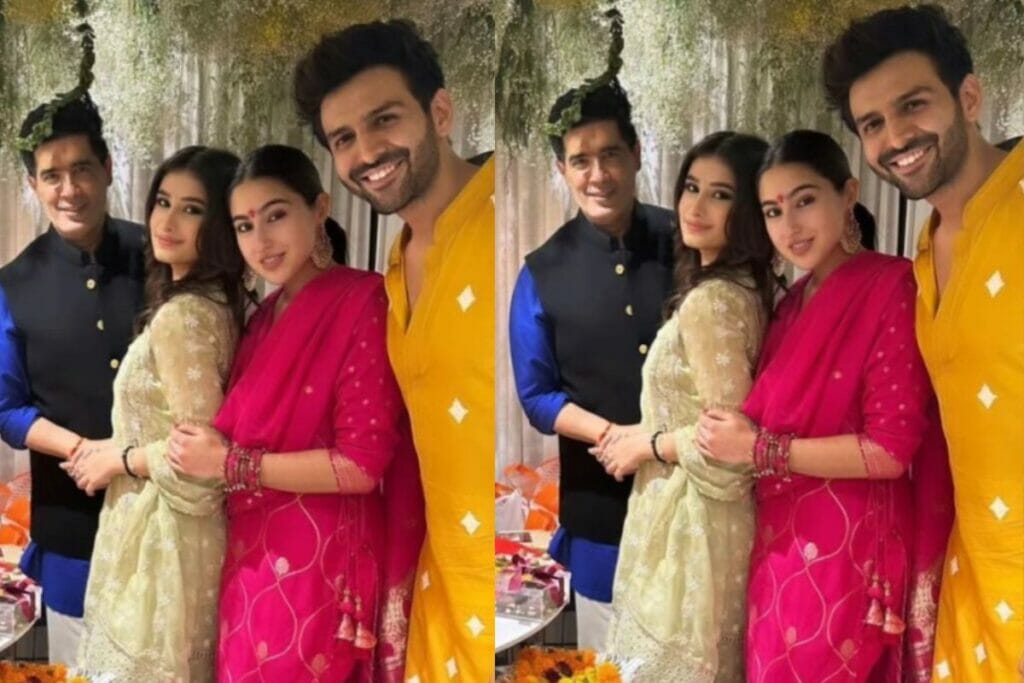 इस तस्वीर के सामने आने के बाद सोशल मीडिया पर मानो अटकलों का बाजार गर्म हो गया और लोग तरह-तरह के कयास लगाकर हवा दे रहे हैं। कहा जा रहा है कि क्या फिर से एक दोनों साथ हो गए हैं। जहां तक सारा अली खान के लुक की बात करें तो वह ट्रेडिशनल लुक में एक बार फिर कहर बरपाती नजर आ रही है। इस दौरान उन्होंने पिंक कलर का सूट, इयररिंग्स और माथे पर तिलक लगाकर अपने लुक को कंप्लीट किया। पोनीटेल हेयर स्टाइल में वह अपनी सादगी से एक बार फिर दिल जीत ले गई। इस तस्वीर में आप देख सकते हैं कि कार्तिक आर्यन सारा अली खान, राशा थडानी और मनीष मल्होत्रा साथ में पोज दे रहे हैं लेकिन लोगों की निगाहें तो कार्तिक और सारा पर है।