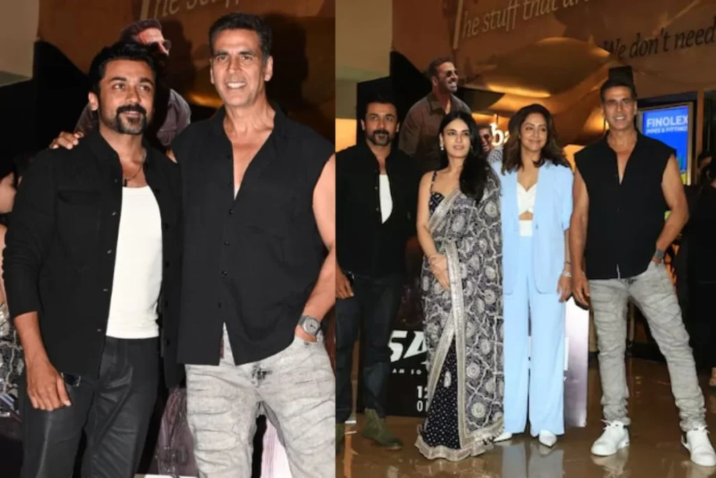 दरअसल अक्षय कुमार की 150वीं फिल्म की स्क्रीनिंग में सूर्या अपनी पत्नी ज्योतिका के साथ नजर आए। इस दौरान सूर्य ब्लैक सूट को व्हाइट टीशर्ट के साथ फ्लॉन्ट करते हुए दिखे तो ज्योतिका लाइट ब्लू ब्लेजर को फ्लॉन्ट करती नजर आई। दोनों का स्टाइल और केमिस्ट्री देखने लायक था और यही वजह है कि सोशल मीडिया पर चर्चा में है। एक तस्वीर में आप देख सकते हैं कि अक्षय सूर्या के साथ पोज देते हुए नजर आ रहे हैं और वे लोगों का दिल जीत गए।