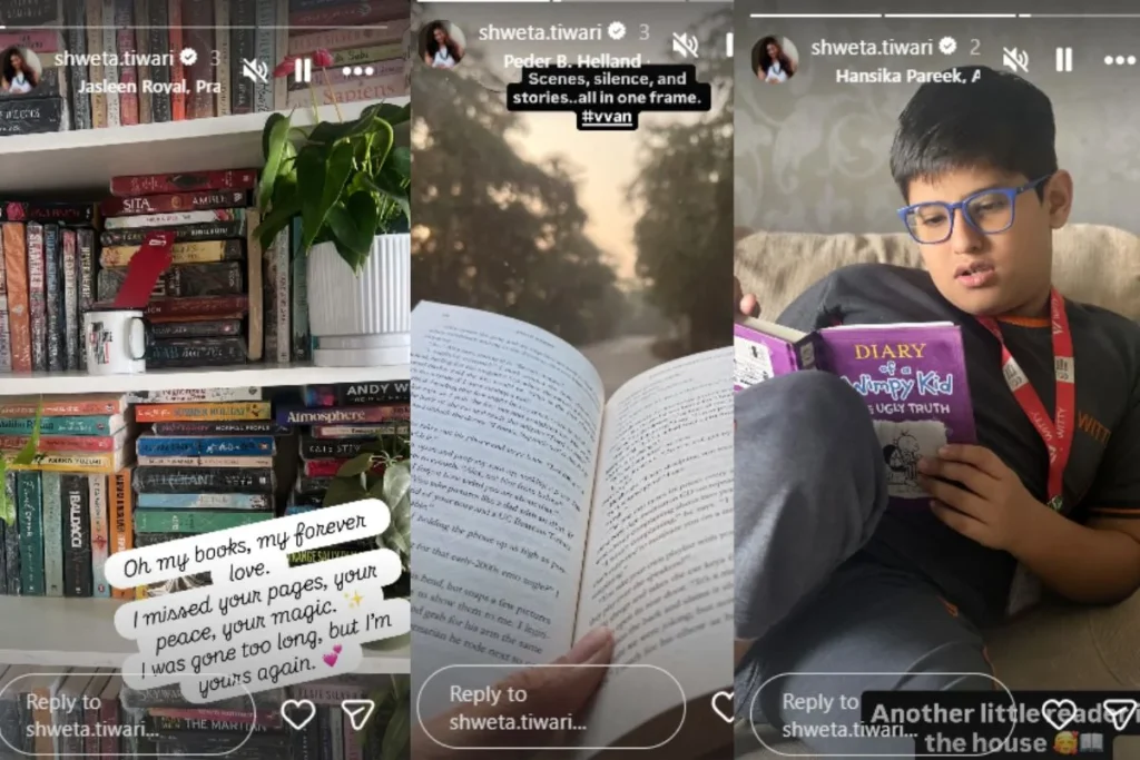 एक और इंस्टा स्टोरी में श्वेता तिवारी ने लिखा, “सीन साइलेंस और कहानी सब एक फ्रेम में।” वहीं सबसे आखिरी पोस्ट काफी खास है जहां श्वेता तिवारी अपने बेटे की तस्वीर शेयर करते हुए कहती है कि “एक और छोटा पढ़ाकू मेरे घर में जहां उनका बेटा भी किताबें पढ़ते हुए नजर आ रहा है। यह सच है कि श्वेता तिवारी अक्सर किताबों के साथ अपनी दोस्ती की झलक सोशल मीडिया पर लोगों को दिखाती है और उन्हें पढ़ना किस कदर पसंद है यह इसे बखूबी दिखाने के लिए काफी है।