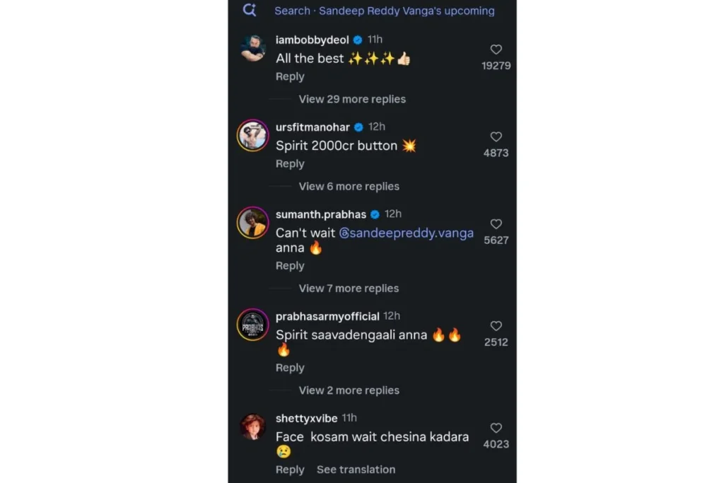 वहीं स्पिरिट संदीप रेड्डी वांगा की ड्रीम फिल्म है जिसकी घोषणा करते हुए उन्होंने लिखा, ” जन्मदिन मुबारक हो प्रभास अन्ना, पांच भारतीय भाषाओं में दिल से निकली एक ‘साउंड-स्टोरी’ पेश कर रहे हैं, हर उस प्रशंसक के लिए जिसने उनके फायर को महसूस किया है।” वहीं इस अनाउंसमेंट को देखने के बाद बॉबी देओल ऑल द बेस्ट कहा है तो वहीं फैंस इसका बेसब्री से इंतजार करने लगे।