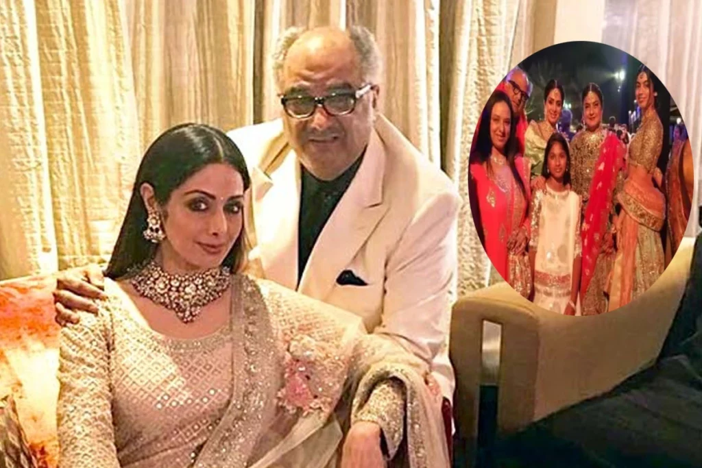 बोनी कपूर ने इंस्टाग्राम पर एक तस्वीर शेयर की है जो मोहित मारवाह की शादी की अनसीन तस्वीर है। इस फोटो में बोनी कपूर, श्रीदेवी और उनकी छोटी बेटी खुशी कपूर साथ नजर आ रहे हैं। इस फोटो में वे कपूर फैमिली के अन्य लोगों के साथ पोज दे रहे हैं। फोटो में श्रीदेवी ग्रीन और गोल्डन कलर की एथनिक ड्रेस में नजर आ रही हैं। उन्होंने इस लुक को नेकलेस और मांगटीका से कम्पलीट किया है।