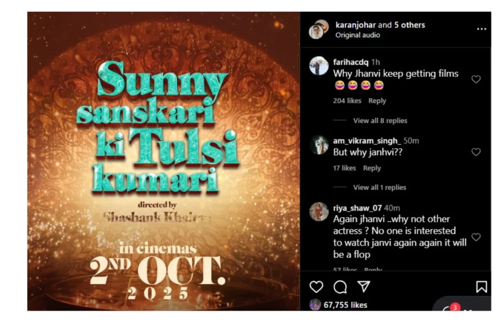 2 अक्टूबर 2025 को सनी संस्कारी की तुलसी कुमारी सिनेमाघरों में रिलीज होने वाली है। दशहरा के मौके पर दस्तक देने के लिए तैयार फिल्म का टीजर 28 अगस्त को जारी किया जाएगा। करण जौहर ने लिखा, “मंडप सजेगा महफिल जमेगी पर सनी और तुलसी की एंट्री सारी स्क्रिप्ट बदल देगी।” वहीं इस मोशन पोस्टर को देखने के बाद लोग जबरदस्त प्रतिक्रिया दे रहे हैं और सुपर एक्साइटमेंट जाहिर करते हुए नजर आए।
