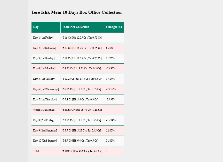 ‘तेरे इश्क में’ एक दिल को छू लेने वाली लव स्टोरी है। इसमें साउथ सुपर स्टार धनुष और बॉलीवुड एक्ट्रेस कृति सेनन ने अभी तक के अपने करियर की सबसे बेस्ट एक्टिंग है। यही वजह है कि, रिलीज के 10वें दिन भी फिल्म ने अच्छी कमाई की है।
