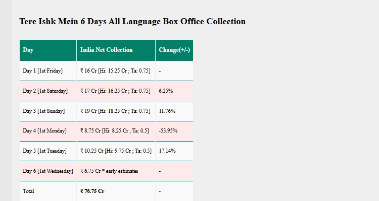 छठे दिन इसने सिर्फ 6.75 करोड़ रुपए ही कमाए हैं। वहीं, पांचवे दिन ये कलेक्शन 10.25 करोड़ रुपए था। ऑपनिंग डे पर 16 करोड़ कमाने वाली ‘तेरे इश्क में’ ने रविवार को सबसे ज्यादा यानी की 19 करोड़ रुपए कमाए थे। लेकिन उसके बाद से बॉक्स ऑफिस कलेक्शन में गिरावट दर्ज की जा रही हैं। कमाई के ये आंकड़े Sacnilk ने जारी किए हैं।