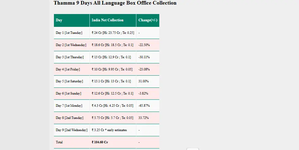 ये अब तक सबसे कम कमाई है। फिल्म के कलेक्शन में लगातार गिरावट दर्ज की जा रही है। इस इस बीच ये फिल्म भारत में 100 करोड़ का कलेक्शन पार करते हुए टोटल कमाई 104.60 करोड़ रुपए है। वहीं, थामा का वर्ल्ड वाइड बॉक्स ऑफिस कलेक्शन 150 करोड़ के आस-पास हो चुका। कमाई के ये आंकड़े Sacnilk ने जारी किए हैं।