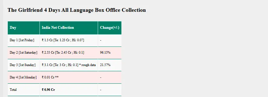 ये प्यार को तलाशती एक लड़की की कहानी है, जो सीधी दिल को छूती है। ‘द गर्लफ्रेंड’ का टोटल बजट 42 करोड़ के आस-पास बताया जा रहा है। ऑपनिंग डे पर ये कमाई 1.3 करोड़ रुपए थी। दूसरे दिन 2.55 करोड़ रुपए का कलेक्शन रहा । वहीं, रविवार को रश्मिका मंदाना की इस फिल्म ने 3.1 करोड़ रुपए कमाए हैं। अन्य दिनों के मुकाबले फिल्म का कलेक्शन जरुर बढ़ा है। लेकिन टोटल कमाई बहुत ही कम है। ‘द गर्लफ्रेंड’ फिल्म की टोटल कमाई 6.96 करोड़ रुपए के आस-पास है। इमरान हाशमी की फिल्म ‘हक’ ने तीसरे दिन 3.75 करोड़ रुपए कमाए थे। दोनों के बॉक्स ऑफिस कलेक्शन पर नजर डालें तो इमरान हाशमी प्रतिदिन और टोटल कलेक्शन में रश्मिका मंदाना की फिल्म से आगे चल रहे हैं। कलेक्शन के ये आंकड़े Sacnilk ने जारी किए हैं।