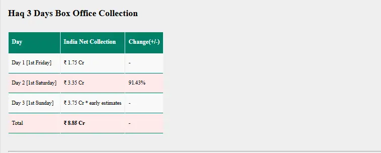 ‘हक’ मूवी का बजट लगभग 35 करोड़ के आस-पास है। ऑपनिंग डे पर इस फिल्म ने 1.75 करोड़ रुपए कमाए थे। दूसरे दिन ये कमाई 3.35 करोड़ रुपए रही। वहीं, तीसरे दिन बॉक्स ऑफिस कलेक्शन 3.75 करोड़ तक पहुंच गया। अभी तक ये मूवी 8.58 करोड़ रुपए कमा चुकी है। आने वाले दिनों में ये कमाई और भी ज्यादा बढ़ सकती है।