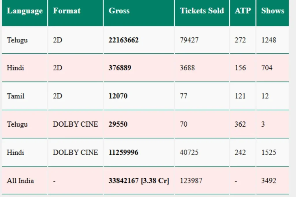 जहां तक बात करें द राजा साब के एडवांस बुकिंग की तो सैकनिल्क की रिपोर्ट की माने तो तेलुगु में ग्रॉस कलेक्शन 2 करोड़ से ज्यादा की हो चुकी है। हिंदी में 2D में 376000 से ज्यादा का ग्रॉस कलेक्शन देखा जा रहा है। तमिल में 12070 तो तेलुगु में 29000 डॉल्बी सीने में तो वही हिंदी में 1 करोड़ से ज्यादा ग्रॉस कलेक्शन डॉल्बी सीने में बताया जा रहा है। इसके साथ ही भारत में 3 करोड़ से ज्यादा का ग्रॉस कलेक्शन सैकनिल्क की रिपोर्ट में कहा गया है लेकिन ब्लॉक सीट में 8.29 करोड़ रुपए है।