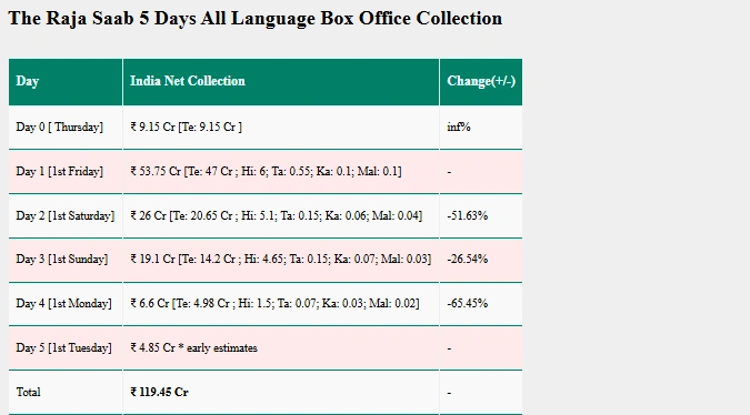‘द राजा साब’ ने रिलीज के पांचवे दिन सिर्फ 4.85 करोड़ रुपए की कमाई की है। भारत में बाहुबली सुपर स्टार प्रभास की मूवी ने 119.45 करोड़ रुपए कमा लिए हैं।