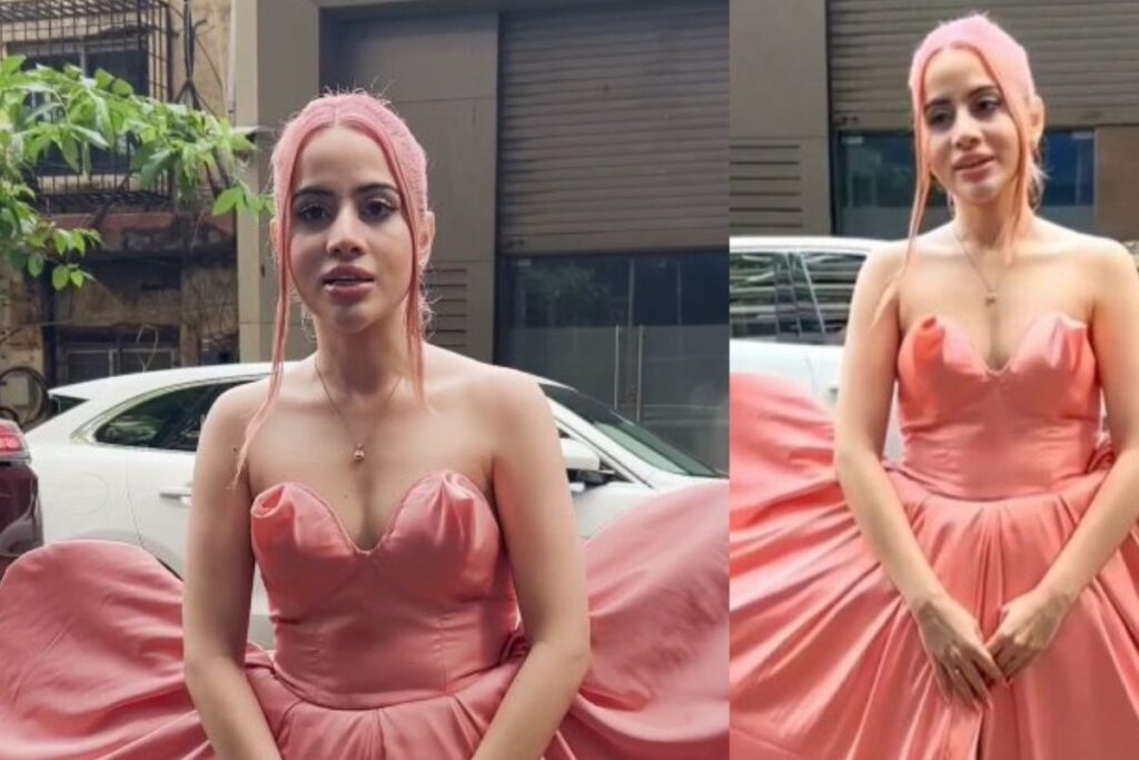 दरअसल उर्फी जावेद इस बार गुलाबी बालों के साथ-साथ गुलाबी ड्रेस में भी स्पॉट हुई है और वह चलती फिरती दिल बनकर लोगों का दिल लूट रही है। वायरल हो रहे इस लुक की बात करें तो बेबी पिंक कलर की हार्ट शेप ड्रेस में उर्फी का यह बार्बी अंदाज वाकई काफी अलग है और वह अपने अंदाज से पैप्स के सामने जमकर पोज देती हुई नजर आई हैं। इस ड्रेस की बात करें तो दोनों तरफ से हार्ट शेप में इसे एक्सटेंड करते हुए उर्फी ने खास तरीके से डिजाइन किया है इतना ही नहीं यह ड्रेस फ्रंट कट स्टाइल में है।