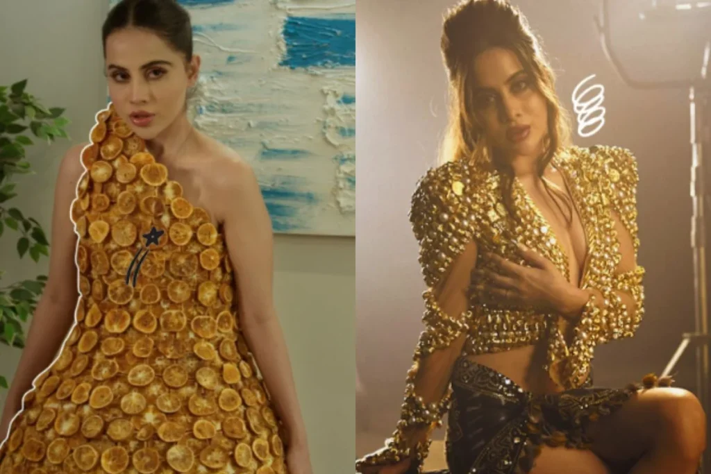 उर्फी जावेद की तस्वीरों की बात करें तो पहली तस्वीर में वह फ्लोर लेंथ ब्लू ग्राउंड में नजर आ रही है जो रफल डिजाइन में है। यह ड्रेस देखकर आपको वह कमेंट तो जरूर याद आया होगा कि ड्रेस है या छाता। दूसरी तस्वीर में उर्फी Citrus की बनी ड्रेस में नजर आ रही है। यह उनकी अजीबोगरीब ड्रेसिंग सेंस को बयां करने के लिए काफी है। एक और तस्वीर में शॉर्ट हेयर स्टाइल के साथ ब्लैक फुल स्लीव टॉप में और भी खूबसूरत नजर आई फिर दिखा ऑफ शोल्डर ग्रीन ड्रेस में उनका हटके अंदाज। वहीं एक और तस्वीर में वह ब्रालेट पर पंखे को लटकाई हुई नजर आई।