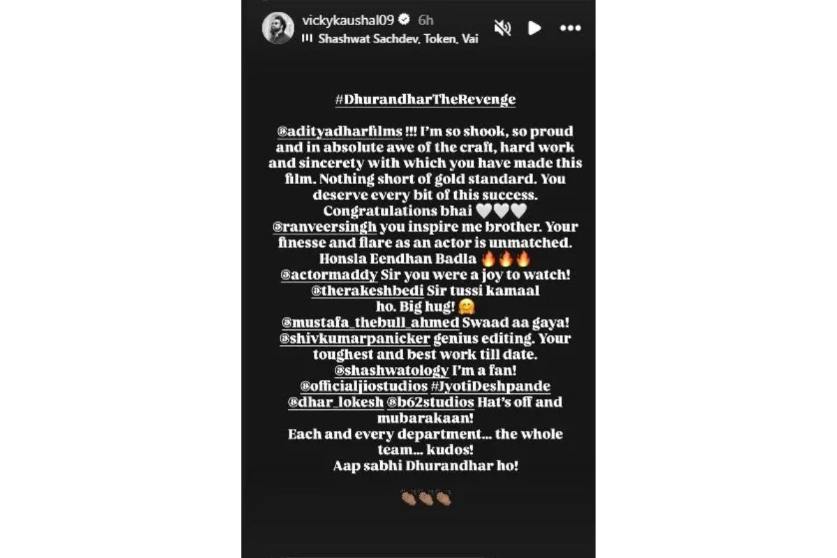 विक्की कौशल ने इंस्टाग्राम स्टोरी पर लिखा, “धुरंधर द रिवेंज… आदित्य धर!!! मैं बहुत हैरान हूं, बहुत गर्व महसूस कर रहा हूं और जिस क्राफ्ट, कड़ी मेहनत और ईमानदारी से आपने यह फिल्म बनाई है, उससे मैं पूरी तरह हैरान हूं। गोल्ड स्टैंडर्ड से कम नहीं। आप इस सफलता के हर हिस्से के हकदार हैं। बधाई हो भाई। रणवीर सिंह, आप मुझे प्रेरित करते हैं भाई। एक एक्टर के तौर पर आपकी कुशलता और जोश बेजोड़ है। हौसला बढ़ाओ।”