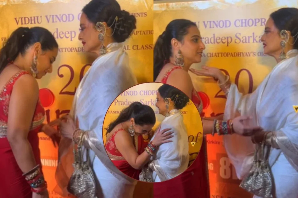 Vidya Balan: 2005 में रिलीज हुई फिल्म परिणीता को आज भी लोग काफी पसंद करते हैं जिसमें विद्या बालन ने अपनी एक्टिंग से डेब्यू फिल्म में ही धमाका कर दिया था। बॉलीवुड इंडस्ट्री में 20 साल और Parineeta की रिलीज को 20 साल होने पर एक बार फिर से इसे री रिलीज किया गया। ऐसे में जश्न का माहौल देखा गया जहां बॉलीवुड के तमाम सितारे शिरकत करते हुए नजर आए। इस सबके बीच Vidya Balan Rekha के साथ जिस तरह से मुलाकात की वह चर्चा में है। सोशल मीडिया पर इस वीडियो को देखने के बाद यूजर्स नेपो किड्स पर साधते नजर आए।