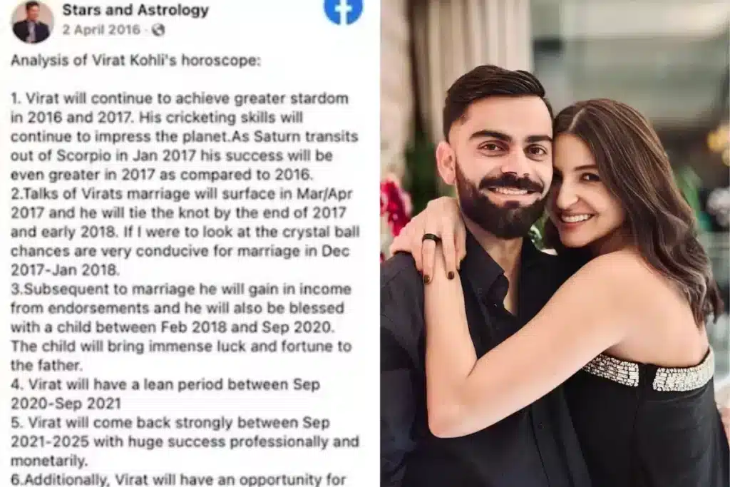 फेसबुक पेज ‘स्टार्स एंड एस्ट्रोलॉजी’ ने 2016 में विराट की कुंडली की पूरी डिटेल तैयार की। जिसमें 2017 के अंत में यानि 11 दिसंबर में अनुष्का शर्मा के साथ कोहली की शादी की सही भविष्यवाणी करने से लेकर उनके करियर की गति का पता लगाने तक था। बता दें कि, इस पोस्ट में स्टार क्रिकेटर विराट कोहली की कुंडली में आठ भविष्यवाणियां की गईं।