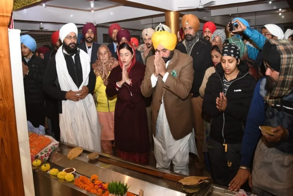 Punjab: आज पूरी दुनिया नए साल 2023 को सेलिब्रेट कर रही है। अब इस खास मौके पर पंजाब के मुख्यमंत्री भगवंत मान भी बड़े ही खास अंदाज में न्यू ईयर सेलिब्रेट करते हुए नजर आए हैं। सीएम भगवंत मान अपने परिवार और पत्नी सहित गुरुद्वारा सिंह शाहिदा सोहाना में नतमस्तक होने के लिए पहुंचे। जहां से उनकी तस्वीर भी सोशल मीडिया पर शेयर की गई है। इस तस्वीर में देखा जा सकता है कि सीएम भगवंत मान अपनी पत्नी डॉक्टर गुरप्रीत कौर सिंह गुरुद्वारे में सिर झुका रहे हैं।