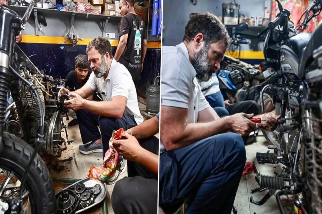 बता दें हम जिस फोटो की बात कर रहे हैं, वह बीते कल (मंगलवार) की है। दरअसल राहुल गांधी कल करोल बाग (दिल्ली) गए थे। जहा वह एक मोटर मैकेनिक की दुकान में जाकर मोटरसाइकिल की पार्ट को ठीक करते नजर आए। इस दौरान उन्होंने काम को बारीकी से सीखा और मैकेनिकों से बातचीत भी की ऐसा तस्वीरों में बया हो रहा है। इसके बाद उन्होंने अपने फेसबुक प्रोफाइल पर फोटो शेयर किए और कहा – “उन हाथों से सीखना जो रिंच घुमाते हैं और भारत के पहियों को गतिमान रखते हैं।”