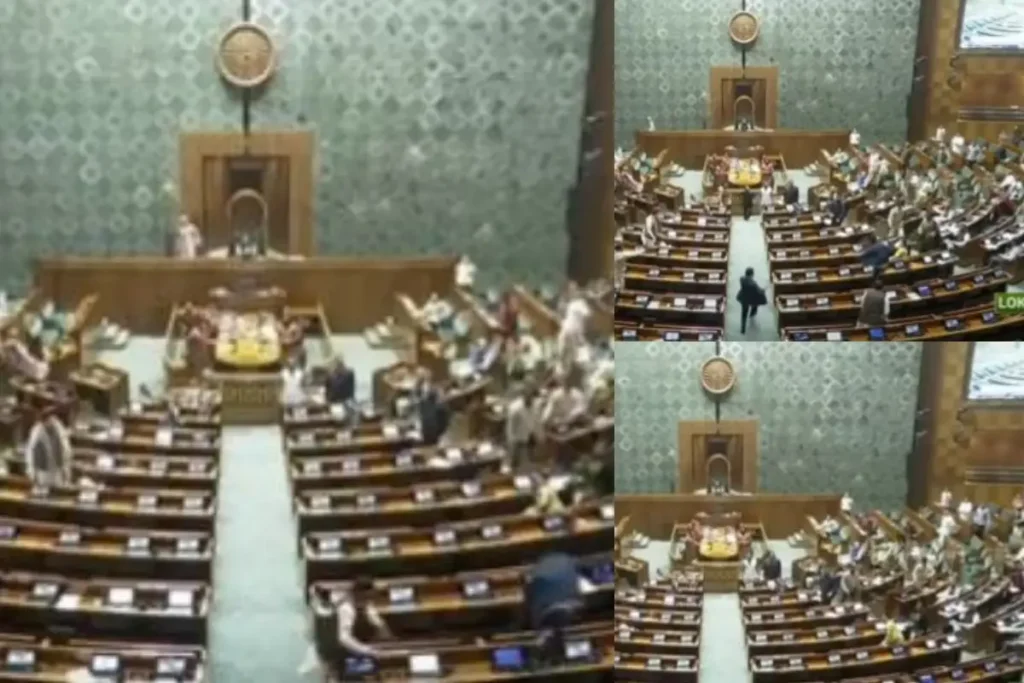 Security Breach in Lok Sabha: 13 दिसंबर 2001 को भारतीय ससंद पर आतंकियों द्वारा हमला किया गया था। इस हमले की चपेट में आने से सुरक्षाकर्मी समेत कुल 9 लोगों की मौत हुई थी। ऐसे में आज आतंकी हमले की बरसी के दिन ही लोकसभा में एक बार फिर सनसनी मचने का मामला सामने आया है। ताजा जानकारी के अनुसार शीतकालीन सत्र की कार्यवाही के दौरान ही अचानक 2 युवक विजिटर गैलरी से बीच सदन में कूद पड़े। इससे सदन में अफरा-तफरी का माहौल देखने को मिला। हालाकि सुरक्षा में तैनात कर्मियों ने तत्काल प्रभाव से दोनों युवकों को हिरासत में ले लिया है।