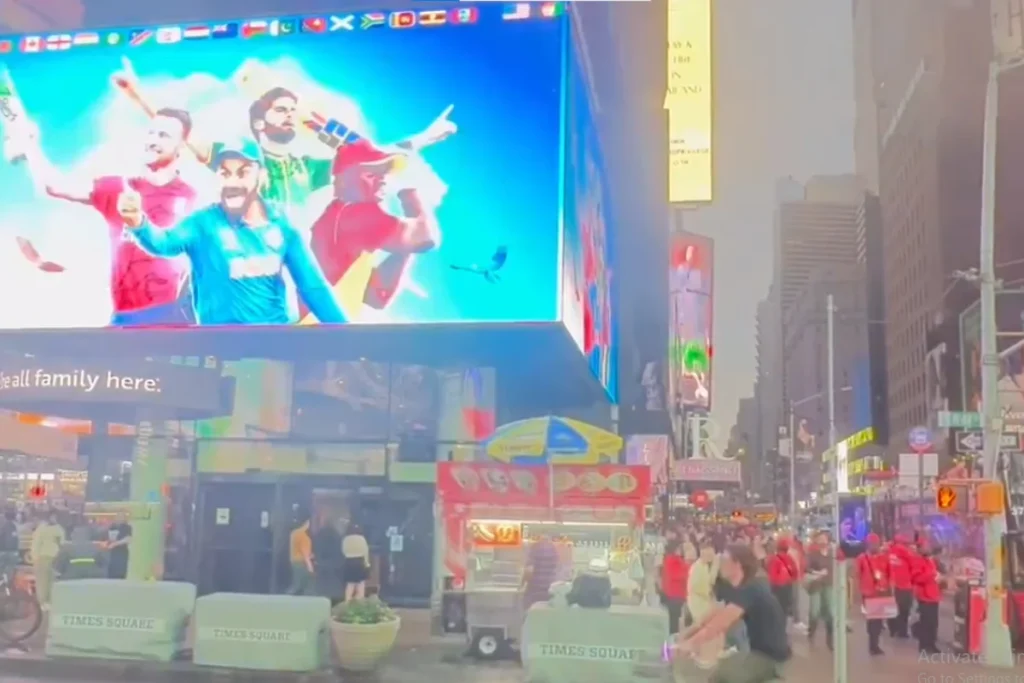 यहाँ Times Square, New York की कई बिल्डिंग्स पर वर्ल्डकप का बोलबाला देखने को मिल रहा है। ऐसा बताया जा रहा है कि USA के लोग भी इस सबसे ज्यादा फैले खेलों में से एक क्रिकेट का विश्वकप देखने के लिए काफी एक्साइटेड और तैयार हैं।