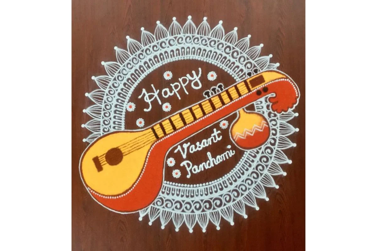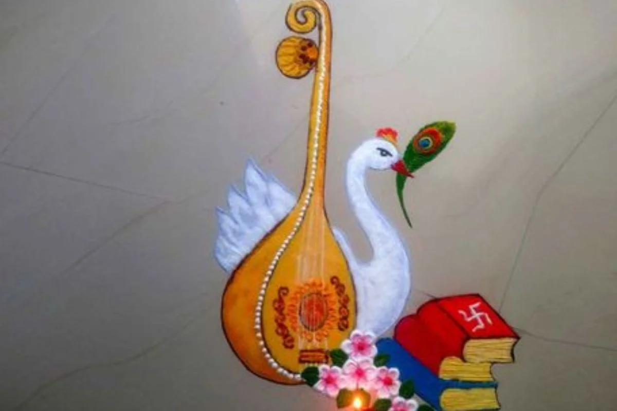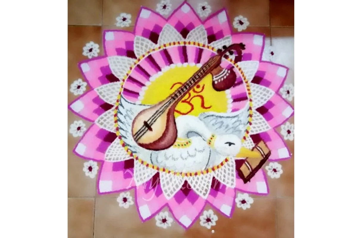 मां सरस्वती को पसंदीदा चीजें वीणा, हंस, मयूर, पंख और किताबों के साथ आप इस रंगोली डिजाइन को भी तैयार कर सकते हैं जो काफी हटके होने वाला है। लोग इसकी तारीफ करेंगे।