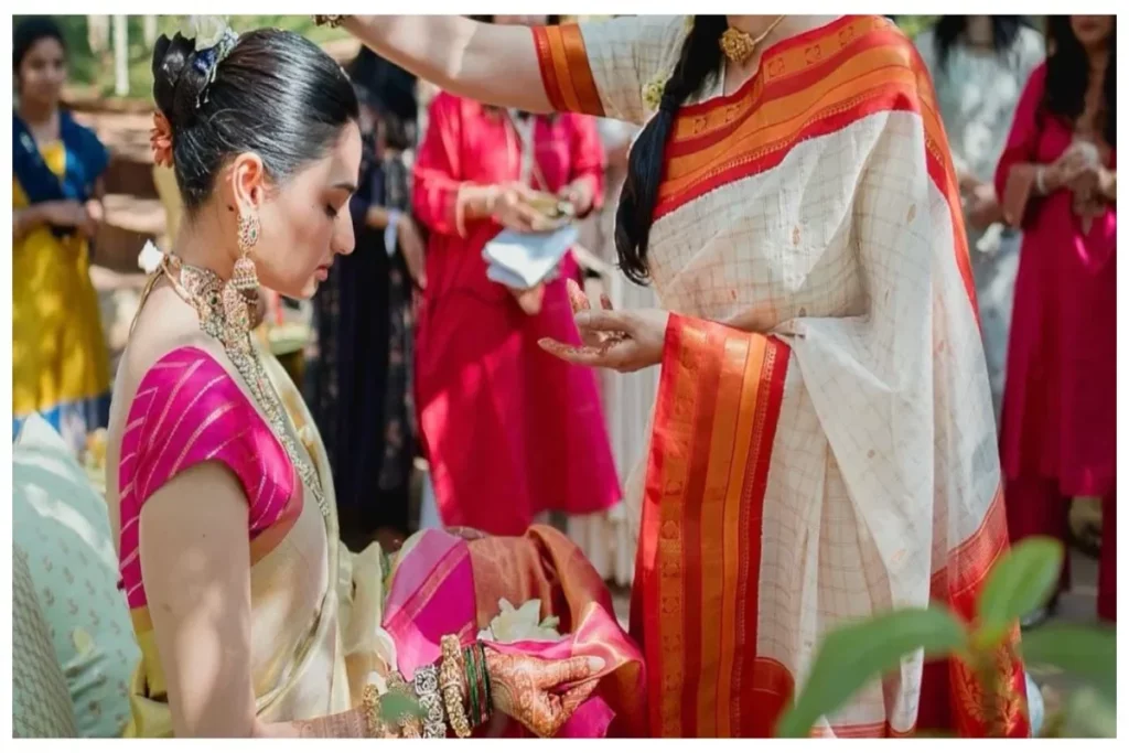सामने आई फोटोस में देखा जा सकता है कि अथिया शेट्टी कुछ रस्में पूरी कर रही है। अपनी मेहंदी की रसम में आथिया शेट्टी ने पारंपरिक साड़ी में सभी का दिल जीता। उन्होंने बालों को बांधा हुआ है और पारंपरिक साड़ी के साथ हैवी ज्वेलरी को कैरी कर रखा है। इसी के साथ उनके हाथों में मेहंदी लगी हुई भी देखी जा सकती है। अपने लुक को और खूबसूरत बनाने के लिए आथिया शेट्टी ने माथे पर बिंदी के साथ टीका भी लगाया हुआ है। अथिया के इस लुक में वह काफी निखर कर सामने आ रही हैं।