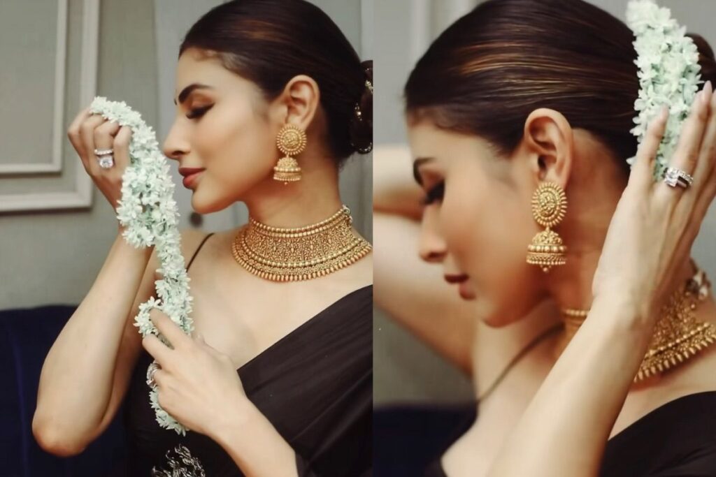 इसके बाद आप भी मौनी की तरह गला बंद हार के साथ झुमके अपने आउटफ़िट के साथ पहन सकती हैं। अगर आप चाहें तो चोकर के डिज़ाइन वाली कोई ज्वैलरी और कानों में उसी से मिलते-जुलते कोई रंगीन स्टोन्स वाले ईयररिंग्स पहनकर इस लुक को एक नयापन दे सकती हैं। इसके बाद आप गजरा लगाकर अपने स्टाइलिश लुक को पूरा करें। गजरे का इस्तेमाल भारतीय महिलाएँ अपने सोलह श्रृंगार में करती हैं। वहीं जब चमेली के सुंदर और ख़ुशबूदार फूलों से बना यह गजरा किसी भी महिला के बालों में लगता है तो यह उसके श्रृंगार को और खूबसूरत बनाता है। इसीलिए आप भी इस ख़ूबसूरत त्योहार पर गजरा लगाकर अपने श्रृंगार को पूरा करें और लोगों से वाहवाही लूटें।