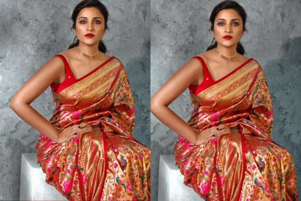 Hartalika Teej 2025 के मौके पर आप परिणीति चोपड़ा की तरह कहर दिख सकती हैं और निश्चित तौर पर पति की नज़रें नहीं हटने वाली है। रेड सिल्क पठानी साड़ी को भी स्टाइल कर सकती हैं। अगर आप इसे स्लीवलेस वी नेकलाइन ब्लाउज के साथ पेयर करती है तो देखने वाले फैन हो जाएंगे। इसके लिए आपको गोल्डन चोकर पहनने की जरूरत है तो इसके साथ-साथ पोनीटेल हेयरस्टाइल और स्मोकी आईज खूबसूरत टच देगा।