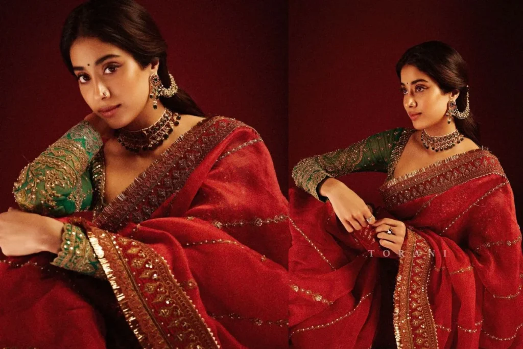 जब साड़ी फैशन की बात होती है तो निश्चित तौर पर Janhvi Kapoor हर किसी पर भारी पड़ती हुई नजर आती है। अगर आप भी जाह्नवी कपूर की तरह खूबसूरत दिखना चाहती हैं तो उनके इस रेड साड़ी लुक को कॉपी कर सकती हैं जिसके साथ उन्होंनें फुल स्लीव ब्लाउज को पेयर किया। आप एक्ट्रेस की तरह इयररिंग्स को ट्राई करें। माथे पर बिंदी लगाकर आपकी खूबसूरती हर किसी के दिल को जीत लेने वाली होगी।