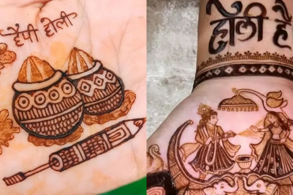 गुलाल खेल रहे राधा कृष्ण की Holi 2025 पर मेहंदी डिजाइन